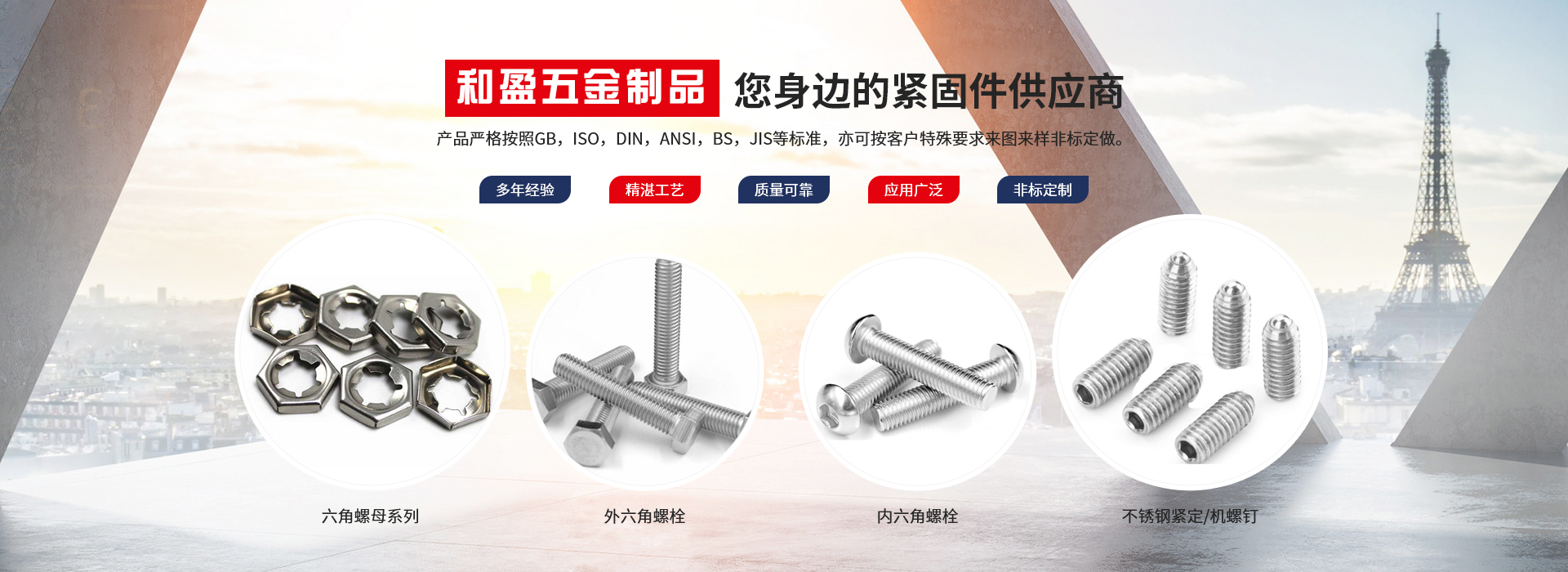 興化市和盈五金制品有限公司創(chuàng)建于2010年,坐落在全國(guó)不銹鋼名鎮(zhèn)———江蘇戴南。本公司集當(dāng)?shù)夭讳P鋼優(yōu)勢(shì)和全國(guó)銷售網(wǎng)點(diǎn),以不銹鋼緊固件產(chǎn)品為主體的企業(yè)。我們將始終如一的堅(jiān)持以客戶為中心,堅(jiān)持以品質(zhì)取勝的發(fā)展戰(zhàn)略,依靠科學(xué)技術(shù)不斷創(chuàng)新。秉承這種精神,我們一起和諧合作,共贏未來。產(chǎn)品嚴(yán)格按照GB,ISO,DIN,ANSI,BS,JIS等標(biāo)準(zhǔn),亦可按客戶特殊要求來圖來樣非標(biāo)定做。產(chǎn)品廣泛應(yīng)用......